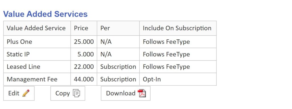 EXAMPLE: Certus Price Plan, which accommodates for Plus One, Static IP, a mandatory ‘Leased Line’ and an optional Management Fee: