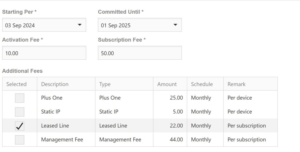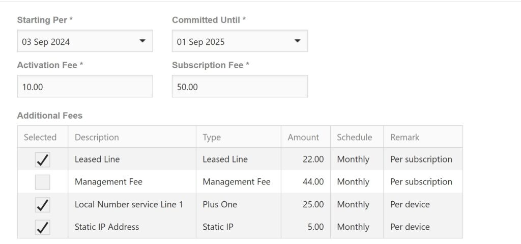 As you can see, all fees are checked, except the Management fee. That was defined as Opt-In on the Price Plan. If the service is required, this is actively selected during activation.